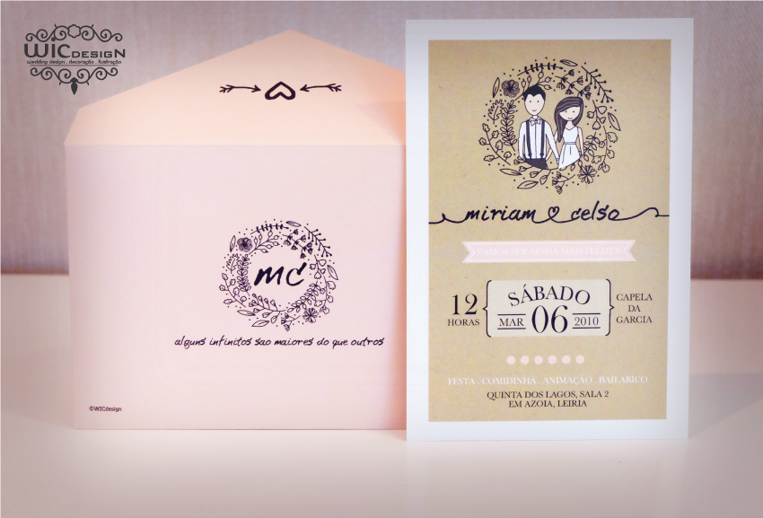 Os cartoons sempre foram um best-seller aqui no atelier. Sempre muito solicitados ao longo destes 9 anos de existência. Passaram modas e tendências, mas os pedidos de cartoons nunca recuaram. Mas agora apetece-me mudar, dar-lhes outro traço, outra dinâmica. Não sei se este tipo de ilustração terá a mesma aceitação dos cartoons anteriores, mas gostava muito de introduzir esta nova possibilidade mais romântica, mais "sóbria", que permita ter um estilo de convite que aponta para o clássico, mas sem perder a personalidade e a originalidade que os cartoons / ilustrações personalizadas dos noivos permitem ter.